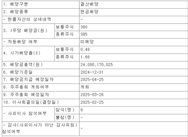 - 배당금: 보통주 360원, 종류주식 385원
